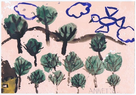 A young child’s painting of a stylised blue bird flying through a cloudy sky, over a landscape with trees and a house in the foreground and mountains behind, complete with silver-fish marks because it was painted in the 1960s.